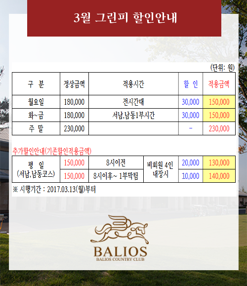 대표이사 : 김육환 개인정보보호책임자 : 신창기업(주)발리오스컨트리클럽 사업자등록번호 : 124-85-09454 통신판매업 등록번호 : 제2009-5530047-30-2-00020호.