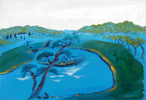 16번홀 파3에 그린 온 하면 앞 호수에서 분수가 솟아 축하 세리머니를 해준다. 이곳 인심으로 아주 내려앉은 청둥오리는 길 떠날 줄 모른다. <그림 김영화> 태풍 지나간 입추 하늘은 뭉게구름 그리고 더욱 초록색 짙어진 녹음이 있는데 선남선녀 솔잎바람에 이마 땀 씻으며 오작교 건너 손에 손잡고 걸어보는 소요의 오솔길 거울같은 호수 건너 덕우리 마을 굴뚝엔 연기만 오르는데 거위친구 쫓아 길 떠나는 줄 모르는 청둥오리의 마음은 뉘 좋아 이곳에 머물꼬. [라종억 시인] [매일경제 발췌]