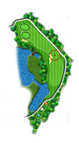 심한 좌측 도그레그 코스이며, 좌측 OB와 전방의 벙커가 부담스러운 홀입니다. 마음의 여유를 가지고 전방 150M 거리목을 보시고 티샷을 하시면 무난합니다.