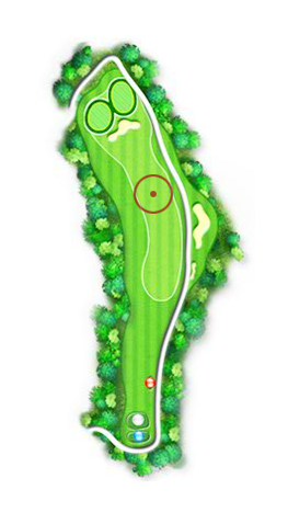 우측이 OB인 좌측 도그레그 홀로써 티잉 그라운드에서 그린은 보이지 않으나 I.P는 넓고 평탄하여 부담없는 홀입니다. 세컨샷은 그린앞 벙커가 크고 깊으니 약간 길게 공략하는 것이 현명합니다.